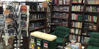 Vintage and current comics, Books on cd and tape, albums and CD’s.