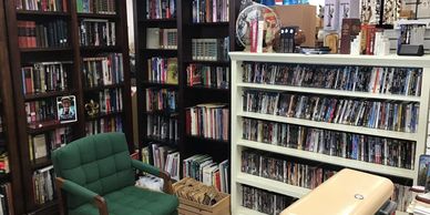Antique, vintage and current books, beautiful book ends, DVD’s, VHS’s.